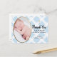 Personalize com a foto do seu filho e o nome do cheio. Este elegante cartão de cartões de agradecimentos batismo facilita o envio da sua gratidão. Substitua a foto usando este modelo editável. Padrão do círculo branco sobre um fundo azul e uma cruz dourada impressa.