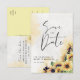 Divulge a data do seu casamento com este cartão postal de girassóis em aquarela. Mistura de caligrafia moderna e arte estilo vintage com tons de amarelo. Todo texto pode ser personalizado, exceto "Salvar a Data". Mais convites de casamento em estilo vintage na nossa loja.