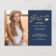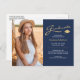 Este anúncio de graduação estiloso de dois lados ou cartão postal de agradecimento apresenta texto moderno fundido com escrita caligráfica elegante em dourado e branco sobre azul marinho. As fotos são uma na frente e uma no verso. Para ver mais itens como este, visite minha loja aqui em "www.Zazzle.com/LakeViewCardCo". Obrigado