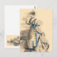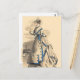 pintura de vintage em azul e branco com uma adorável senhora vestida de roupa vitoriana na beira-mar acenando adeus a um navio no mar, ela está vestindo um bonito chapéu branco com flores azuis e véu, vestido bege com guarnições de fita azuis e botões azuis no estilo da faixa decorativa, e acenando um grande cachecol branco que sopra no mar enquanto o barco voa para um oceano uma com ondas fortes na brisa do oceano ventoso, como a senhora de um vestido vitoriano longo olha para o navio distante no mar