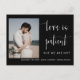 Este postal de convite para o anúncio do casamento apresenta uma caligrafia elegante e uma letra simples de tipografia sans serif com uma fotografia num fundo preto para um olhar limpo minimalista e moderno, que é uma bela forma de informar sobre o seu próximo casamento. A simplicidade desta design adiciona um toque de elegância aos seus cartões de anúncio de casamento. Funciona bem com muitos temas de casamento e definitivamente um excelente extra para o seu casamento. Apenas personalize os nomes e o texto em alguns passos fáceis e personalize o cartão-postal do convite com sua foto do casal feliz para dar um toque pessoal agradável ao seu cartão-postal. Por favor, note-se: a elegante caligrafia das expressões "O amor é paciente, mas não somos" e "nada de rico só o amor", juntamente com as linhas e outras trabalhos de arte gráficas e elementos não podem ser editados, apagados ou movidos. Eles estão consertados. EXEMPLO: se você quiser obter uma amostra deste cartão-postal, poderá solicitar apenas UM cartão (alterar a quantidade para UM) e selecionar suas preferências para ver como ele é exibido e se sente. Pode consultar o resto dos nossos produtos no Zazzle em https://www.zazzle.com/store/1creativemastermind/products Se quiser consultar o nosso compro sobre o Etsy, pode consultar 1CreativeMastermind.etsy.com