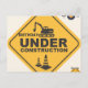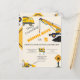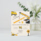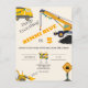 Convite de Aniversário Em Construção com caminhões, guindaste e trator. Convite de festa temática de construção fofa. Esquema de cores amarelo, laranja, branco, preto e cinza.