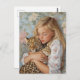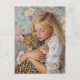 Uma jovem loira abraça carinhosamente um leopardo, seus olhos fechados em um momento sereno de confiança e conexão. O fundo apresenta um padrão floral delicado, somando-se à atmosfera de sonho.