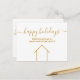Este cartão-postal de Feliz Feriados moderno é personalizado com o nome da sua empresa real sob a tipografia quic. Estes cartões postais minimalistas, brancos e dourados, apresentam um desenho simples de uma casa. Eles são perfeitos para enviar aos clientes que compram casa passados para lembrá-los de encaminhar amigos e familiares que procuram comprar ou vendem sua casa. Marketing de negócios imobiliário significa tentar repetir clientes e solicitar suas remessas.