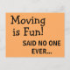 Este é um simples design de texto minimalista com duas fontes e um sarcástico e engraçado e sarcástico pelotão na frente que diz: "Mover é divertido!" disse que ninguém nunca... num fundo laranja vibrante. O verso diz: Mas nós conseguimos! Anote nosso novo endereço e há uma modelo de texto para você adicionar seu novo endereço ou você pode apagar essa peça e gravá-la manualmente. Um cartão postal é uma forma econômica divertida de enviar o seu anúncio comovente sobre um orçamento.