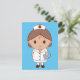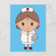Enfermeira de desenho animado fofa com cabelo castanho e um sorriso doce. Ela está vestindo um uniforme de enfermeira branco e chapéu e carregando uma pasta médica azul sob um braço.