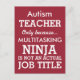 Este cartão-postal engraçado diz Autismo Professor, só porque Multitasking Ninja não é um título de trabalho. Este cartão postal pode ser personalizado para dizer Professores com Necessidades Especiais, Professores com Síndrome de Down, ou até mesmo um Professor Especial em geral. O plano de fundo é Vermelho, mas você pode alterá-lo clicando em Personalizar. Avise-me se precisar de ajuda para mudar a cor de fundo. Por causa da fonte branca, é melhor usar cores escuras. Estes cartões postais são excelente de luz fazer do desafio que representa ser um professor de necessidades especiais, um instrutor, um assistente de ensino de assistência técnica ou um assistente de instrução de assistência. Como mãe de um garoto autista, sei que precisamos ter um bom riso e manter um senso de humor. Estas cartas fazem um presente barato para mostrar o seu apoio numa ocasião como a Apreciação do Professor.