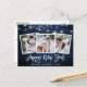 Cartão-postal com Feliz ano novo de Escova de Madeira Azul Rústica com Script 3 Fotográfico com Luzes de Cordas