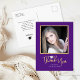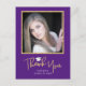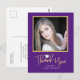 Um simples obrigado de graduação que você faz com uma foto quadrada acentuada com uma falsa borda de ouro brilhante em um fundo roxo. O design oferece um texto de estilo dourado e manuscrito. O backside oferece texto personalizado para sua própria mensagem de obrigado pessoal.