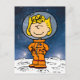 Esta obra de Peanuts comemora o 50º aniversário da órbita do Apollo 10 de 1969 da lua e o pouso na lua do Apollo 11. Este design apresenta Sally Brown em seu traje espacial laranja.