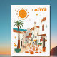 Este cartão-postal Altea, de Costa Blanca, Espanha é uma bela obra de arte. Apresenta uma bela cidade mediterrânica antiga com casas brancas, uma rua de pedra calcária, uma palmeira e um grande sol. É um cartão de boas-vindas perfeito para moradores, visitantes, turistas ou fãs de Altea.
