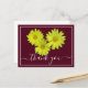 Fotografia impressionante, com um recorte aproximado de três belas margaridas amarelas contrastadas contra um fundo colorido de vinho. Este cartão postal é oferecido em vários planos de fundo de cores diferentes. As margaridas cobrir a frente deste cartão que pode ser usado como cartões de agradecimentos, cartão de aniversário ou qualquer outro cartão de sua escolha. Personalize-o com seu texto e/ou imagens para torná-lo de um tipo!