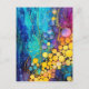 Uma pintura apresenta bolhas de cor vívida contra fundo azul profundo no estilo de abstrato geométrico. As cores são ricas e vibrantes, criando um visual atraente e dinâmico.