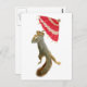 Um esquilo está rolando junto com um parasol vermelho e branco neste cartão postal de verão divertido.