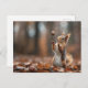 Esquilo fofo tentando pegar uma bolota no ar na floresta de outono exuberante.