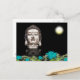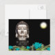 Uma estátua de cabeça prateada de Buda, refletindo sobre a água preta cheia de flores de turquesa lotus flutuantes e almofadas de lírios verdes. Fundo preto.