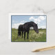 Um cavalo preto estica seu pescoço barroco por baixo e longo para ter uma melhor visão através da cerca. Esta fotografia parece que foi tirada com uma lente de olho de peixe.