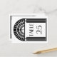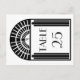 Um cartão postal com o número da mesa de casamento do estilo preto e branco, em negrito, preto e branco, impresso em ambos os lados e exibido no retrato ou na orientação vertical. Um padrão de explosão solar e listras de pilares encerram a fonte decorativa e uma silhueta de uma noiva com seu noivo. Art Deco foi um estilo popular ao longo do 1920, nos anos 1930 e 1940.