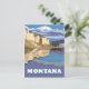 Ilustração do estilo viagens vintage de Montana mostrando montanhas e cena do rio. O nome Montana está embaixo em uma fonte retrô. Isto foi modificado a partir de uma poster do Bureau of Land Management da zona do Monumento Nacional do Alto rio Missouri.