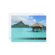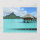 Cartão-postal de um luxo "bungalow" sobre água na clara lagoa azul da ilha pacífica de Bora Bora, perto de Tahiti, na Polinésia Francesa, com um bar preto esmaecido e o texto: "Bora Bora".