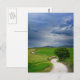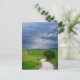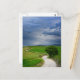 Cartão postal de uma estrada de sujeira branca enrolada (strada bianca) através das colinas verdes rolantes da paisagem do Vale de Val d'Orcia, na Toscana, Itália, sob nuvens escuras no céu.