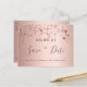 Um cartão "Salve a data" feminino e glamouroso para uma festa de aniversário de 18 anos. Um rosa feminino, rosa dourado falso, fundo metálico com aspecto decorado com estrelas cintilantes rosa douradas. Modelos para uma data e seu texto. Letras rosa escuras de cor dourada. O texto: Salvar a Data é gravado com um script de estilo com letra de tendência grande. Fundo: rosa dourado. Modelos para os detalhes da sua festa. Texto preto.