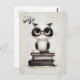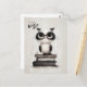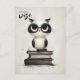 Um postal de volta à escola com um texto personalizável "no sentido do estudo" com a ilustração de uma coruja peluda em cima de uma pilha de livros.