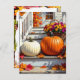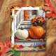 Um adorável cheio de Cartaz de Ação de Graças de folhas vibrantes coloridas e abóboras sentadas em uma fazenda de frente. Você pode personalizar sua mensagem de Ação de Graças no verso na área de personalização.