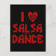 Este cartão-postal diz "Eu amo dançar salsa" em uma fonte vermelha com espirais dentro dele, como todas as curvas suaves da dança salsa. O "amo" é um coração vermelho com uma espiral para combinar com as letras.