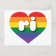 Este cartão postal apresenta um coração com orgulho de arco-íris com as letras minúsculas e brancas em negrito ri, uma versão divertida da abreviação de Rhode Island, o estado do oceano. O verso do cartão postal está em branco, aguardando seus sentimentos manuscritos ou texto personalizado. Mostre suas verdadeiras cores, apoie a igualdade no casamento e celebre o orgulho gay.