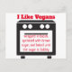 Eu gosto de veganos postais engraçados anti-veganos zombam de veganos, dizendo em letras grandes e ousadas: "Eu gosto de veganos." Depois, em letras menores numa porta do forno, a frase diz, "embrulhada em bacon, aspergida com açúcar castanho, e cozida até o açúcar estar borbulhado." Mmmm... gostoso, certo? Está tudo em jest, e o ditado sarcástico neste cartão postal certamente trará risada aos receptores, sejam eles veganos ou não-veganos. É um cartão postal ofensivo? Não se você tem senso de humor. Pegue um monte; riso ajuda a livrar-se de todas as toxinas que estamos comendo.