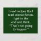 Comemore sua falta de habilidades do cozinhar! Lê-me "lêem receitas como eu leio a ficção científica. Eu obtenho à extremidade e penso, "que não está indo acontecer." Disponível no impressão verde, vermelho ou branco.