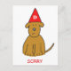 Um desenho de um cachorro marrom fofo, com um aspecto triste, com um chapéu de duna vermelha e a palavra "SORRY" escrita embaixo.