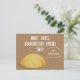 Um cartão postal que apresenta uma piada sobre pão. O design pergunta “O que diz o pão de massa mãe?” E então o pão ilustrado abaixo diz “Eu sou um iniciador!” A paleta de cores do cartão postal é marrom e branco.