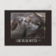 Um cartão postal com uma fotografia fofa e romântica com duas lontras apaixonadas. Uma lontra está lambendo o rosto da outra lontra, os olhos fechados parecem felizes como podem ser. O texto diz "Eu te amo como sem lontra" com um coração de rabisco bonito.