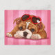 Adorável cachorrinho inglês com óculos escuros, em fundo listrado rosa, pintado pela artista Maryline Cazenave.
