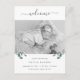 Este cartão postal de anúncio de nascimento de bebê simples e elegante apresenta folhas de cor aquática verde minimalista de folhas de eucalipto num fundo branco limpo com escrita manual. Adicione a sua foto favorita do seu recém-nascido para completar este olhar botânico.