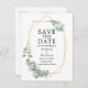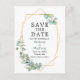 O moderno Elegante Watercolor Eucalyptus Greenery Noivado Anúncio de Casamento Salvar O Cartão-Postal de Data inclui folhas de eucalipto numa moldura geométrica dourada.