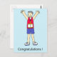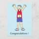 Um homem de desenho animado com os braços no ar, com o número um no peito. A palavra 'Parabéns' está debaixo da imagem.