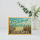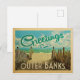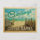 Esta saudação do Outer Banks vintage postcard design apresenta uma praia arenosa com uma bela água turquesa oceânica e acima do mar, um céu azul com nuvens brancas e onduladas. No estilo viagens vintage.