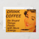 Uma mulher sorridente com batom vermelho retrorado e unhas bebe sua xícara de café da manhã. A legenda diz "Beba café - Faça coisas estúpidas mais rapidamente com mais energia."