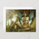 Cartão de fantasia com uma bela fada em um traje dourado sentada em uma rocha na floresta mágica.