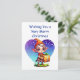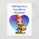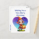 Cartões-postais de Natal que podem ser personalizados. Fada fofa com fundo azul nevado segurando um presente. Adicione sua própria mensagem pessoal na frente e no verso.