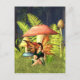 Fada bonito sentada por cogumelos ou ferramentas de madeira e samambaias num glade florestal ensolarado, ilustração 3d feita digitalmente