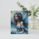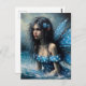 Uma adorável fada irritada num vestido de bolinhas azul e branca no oceano. Ela está aborrecida porque uma lufada de vento a jogou na água em vez de pousar na praia arenosa.