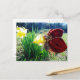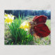 Fada com asas vermelhas e o vestido roxo que cheiram na fada e na foto das flores dos Daffodils do amarelo pela fada de Sandy Closs do artista, fadas, duende, duendes, fantasia, flores, borboleta, borboletas, vermelho, amarelo, roxo, conto de fadas do primavera, fairyland