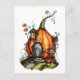 A imagem retrata uma casa brilhante, ao estilo de conto de fadas, em forma de uma grande abóbora laranja vibrante. A abóbora transformou-se numa moradia acolhedora com uma porta de madeira na frente, duas pequenas janelas nas laterais e duas estruturas quintas, semelhantes a torre, no topo, com telhados vermelhos. A casa é rodeada de videiras tortuosas e folhas de outono, somando-se à atmosfera mágica e encantada. O cenário sugere um ambiente sereno, a floresta, perfeito para uma fada de livros de histórias ou criatura mágica.