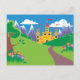 Cena do castelo do conto de fadas. Através de um campo verde com flores, senta-se um castelo de livros de histórias nas montanhas contra nuvens brancas num céu azul nesta divertida ilustração infantil.