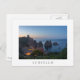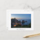 Cartão postal das grandes rochas de Faraglioni na água do mar Mediterrâneo e da antiga fábrica de atum vermelha de Scopello, na costa norte da Sicília, Itália, na Hora Azul do anoitecer, com uma fronteira branca, e o texto "Scopello".