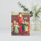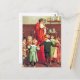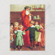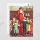 Lovely nostalgic vintage illustration of Papa Noël, or Father Christmas, blowing a horn while cute little children are cheerfully dancing hand in hand in a circle around him.